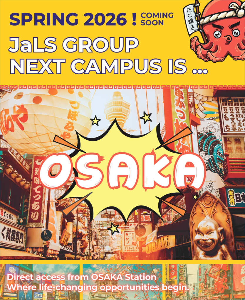 En junio de 2026, el Grupo JaLs inaugurará una escuela nueva en Osaka, la segunda ciudad más grande de Japón, conocida por su ambiente acogedor y un coste de vida más económico que el de otras ciudades grandes. La escuela nueva está ubicada en el centro de la ciudad, y está bien comunicada para facilitar moverse tanto por Osaka, como por las ciudades de alrededor como Kyoto, Nara o Kobe. Se aplicarán los métodos educativos de alta calidad cultivados en las escuelas de Hokkaido y Tokyo, introduciendo la cultura y el dialecto particulares de Osaka. Por supuesto seguirá las características del Grupo JaLs de siempre como: – Cursos a partir de una semana – Un máximo de 8 alumnos por clase – Amplia variedad de experiencias culturales y actividades sociales